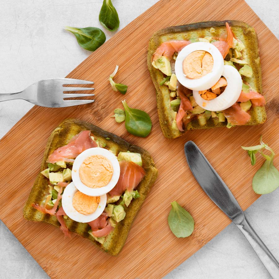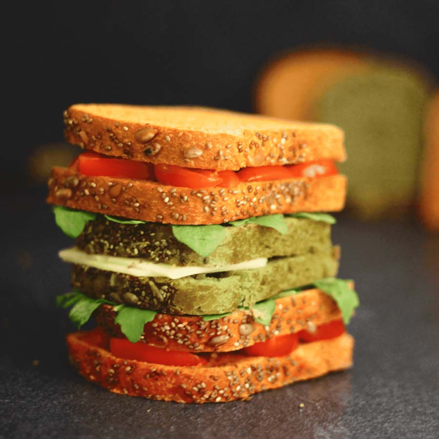 Pains aux légumes verts et légumineuses gourmands et protéinés, source de fibres à base légumes verts et légumineuses pour des sandwiches, croque-monsieur, toast et tartines équilibrés et boostés en nutriments.